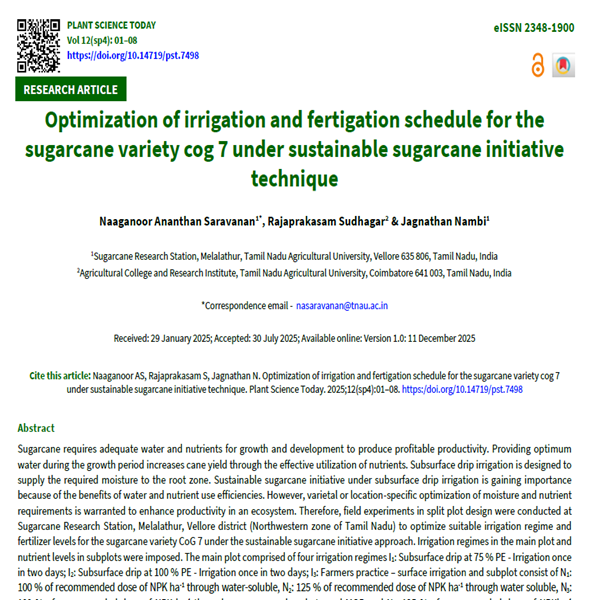 Sugarcane requires adequate water and nutrients for growth and development to produce profitable productivity. Providing optimum water during the growth period increases cane yield through the effective utilization of nutrients. Subsurface drip irrigation is designed to supply the required moisture to the root zone. Sustainable sugarcane initiative under subsurface drip irrigation is gaining importance because of the benefits of water and nutrient use efficiencies. However, varietal or location-specific optimization of moisture and nutrient requirements is warranted to enhance productivity in an ecosystem. Therefore, field experiments in split plot design were conducted at Sugarcane Research Station, Melalathur, Vellore district (Northwestern zone of Tamil Nadu) to optimize suitable irrigation regime and fertilizer levels for the sugarcane variety CoG 7 under the sustainable sugarcane initiative approach. Irrigation regimes in the main plot and nutrient levels in subplots were imposed. The main plot comprised of four irrigation regimes I1: Subsurface drip at 75 % PE - Irrigation once in two days; I2: Subsurface drip at 100 % PE - Irrigation once in two days; I3: Farmers practice – surface irrigation and subplot consist of N1: 100 % of recommended dose of NPK ha-1 through water-soluble, N2: 125 % of recommended dose of NPK ha-1 through water soluble, N3: 100 % of recommended dose of NPK ha-1 through urea, super phosphate and MOP and N4: 125 % of recommended dose of NPKha-1 through urea, super and MOP. These treatments were replicated thrice. The experiments were conducted for 6 years. The combined result revealed that sub-surface drip irrigation at 100 % PE once in two days and application of 125 % of RDF of NPK ha-1 through water soluble fertilizers recorded the highest cane yield.