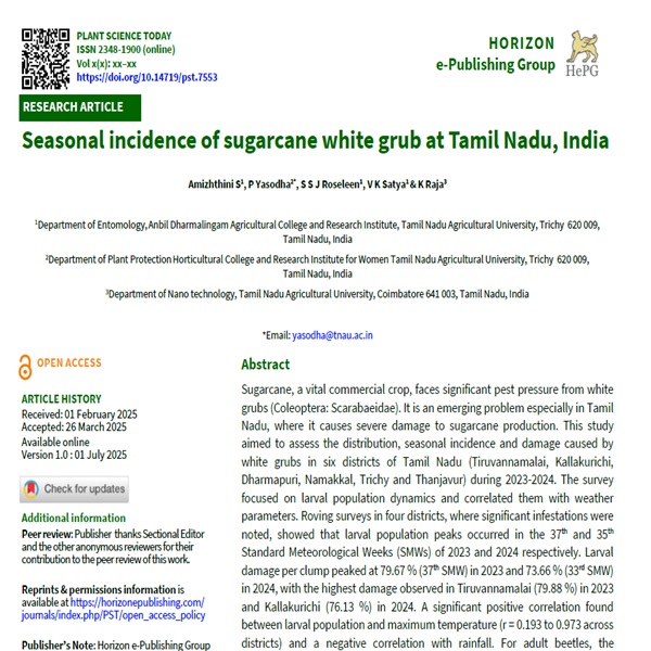 Sugarcane, a vital commercial crop, faces significant pest pressure from white grubs (Coleoptera: Scarabaeidae). It is an emerging problem especially in Tamil Nadu, where it causes severe damage to sugarcane production. This study aimed to assess the distribution, seasonal incidence and damage caused by white grubs in six districts of Tamil Nadu (Tiruvannamalai, Kallakurichi, Dharmapuri, Namakkal, Trichy and Thanjavur) during 2023-2024. The survey focused on larval population dynamics and correlated them with weather parameters. Roving surveys in four districts, where significant infestations were noted, showed that larval population peaks occurred in the 37th and 35th Standard Meteorological Weeks (SMWs) of 2023 and 2024 respectively. Larval damage per clump peaked at 79.67 % (37th SMW) in 2023 and 73.66 % (33rd SMW) in 2024, with the highest damage observed in Tiruvannamalai (79.88 %) in 2023 and Kallakurichi (76.13 %) in 2024. A significant positive correlation found between larval population and maximum temperature (r = 0.193 to 0.973 across districts) and a negative correlation with rainfall. For adult beetles, the maximum mean population of 105.49 adults/trap/week was recorded in the 24th SMW at Tiruvannamalai, with a general emergence starting from the 15th SMW (April). A significant positive correlation was observed between adult emergence and rainfall (r = 0.647 to 0.898) and minimum temperature (r= 0.456 to 0.743). Conversely, maximum temperature showed a negative correlation with adult emergence. These findings provide valuable insights for the development of Integrated Pest Management (IPM) strategies and enabling timely interventions to mitigate crop damage.