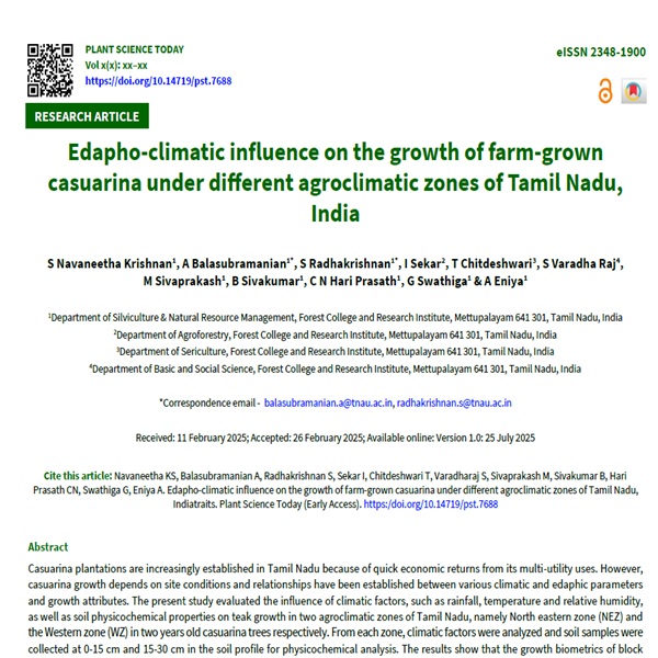 Casuarina plantations are increasingly established in Tamil Nadu because of quick economic returns from its multi-utility uses. However, casuarina growth depends on site conditions and relationships have been established between various climatic and edaphic parameters and growth attributes. The present study evaluated the influence of climatic factors, such as rainfall, temperature and relative humidity, as well as soil physicochemical properties on teak growth in two agroclimatic zones of Tamil Nadu, namely North eastern zone (NEZ) and the Western zone (WZ) in two years old casuarina trees respectively. From each zone, climatic factors were analyzed and soil samples were collected at 0-15 cm and 15-30 cm in the soil profile for physicochemical analysis. The results show that the growth biometrics of block plantations of casuarina trees were positively correlated with climatic and edaphic factors. Maximum and minimum temperature, pH, electrical conductivity, organic carbon and available nitrogen showed significant positive correlations with the tree volume index. This studys’ key finding is that the casuarinas’ growth varies among agroclimatic zones, which can be monitored by means of edapho-climatic factors that influence casuarina plantations.
