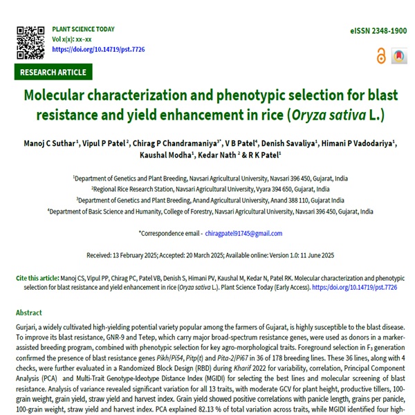 Gurjari, a widely cultivated high-yielding potential variety popular among the farmers of Gujarat, is highly susceptible to the blast disease. To improve its blast resistance, GNR-9 and Tetep, which carry major broad-spectrum resistance genes, were used as donors in a marker-assisted breeding program, combined with phenotypic selection for key agro-morphological traits. Foreground selection in F3 generation confirmed the presence of blast resistance genes Pikh/Pi54, Pitp(t) and Pita-2/Pi67 in 36 of 178 breeding lines. These 36 lines, along with 4 checks, were further evaluated in a Randomized Block Design (RBD) during Kharif 2022 for variability, correlation, Principal Component Analysis (PCA) and Multi-Trait Genotype-Ideotype Distance Index (MGIDI) for selecting the best lines and molecular screening of blast resistance. Analysis of variance revealed significant variation for all 13 traits, with moderate GCV for plant height, productive tillers, 100-grain weight, grain yield, straw yield and harvest index. Grain yield showed positive correlations with panicle length, grains per panicle, 100-grain weight, straw yield and harvest index. PCA explained 82.13 % of total variation across traits, while MGIDI identified four high-performing lines; 22KSMF4-8, 22KSMF4-5, 22KSMF4-6 and 22KSMF4-14. Molecular screening of F₄ progenies identified nine F₄ derivatives carrying three blast resistance genes, with two (Gurjari × GNR-9) exhibiting superior grain yield and quality over Gurjari, making them promising candidates for developing high-yielding, blast-resistant varieties.