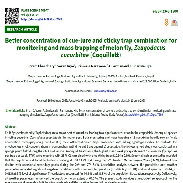 Fruit fly species (family: Tephritidae) are a major pest of cucurbits, leading to a significant reduction in the crop yields. Among all species infesting cucurbits, Zeugodacus cucurbitae is the major pest. Both monitoring and mass trapping of Z. cucurbitae heavily rely on ‘male annihilation technique, using cue-lure (CL) male attractant-based traps embedded with killing agents/pesticides. To evaluate the effectiveness of CL concentrations in combination with different traps against Z. cucurbitae, the following field study was conducted in a sponge gourd field during the 2023 zaid season. Among all treatments, the highest mean weekly trap catches of Z. cucurbitae (fly captures per trap per week, FTW) were recorded with 25 % CL combined with blue sticky traps (10.16 ± 0.99). Seasonal incidence studies revealed that the population exhibited fluctuations, peaking at 9.80 ± 1.29 FTW during the 17th Standard Meteorological Week (SMW), followed by a decline with occasional secondary peaks during the 20th and 27th SMW. Correlation analysis between the population and weather parameters indicated significant negative correlations with minimum temperature (r = -0.666, p = 0.004) and wind speed (r = -0.604, p = 0.013) at 5 % level of significance. These factors accounted for 44.4 % and 36.5 % of the population fluctuation, respectively. Collectively, all weather parameters influenced the population to an extent of 60.3 %. The present study provides a pesticide-free approach for the management of the melon fruit fly, after considering all the weather factors influencing the results.