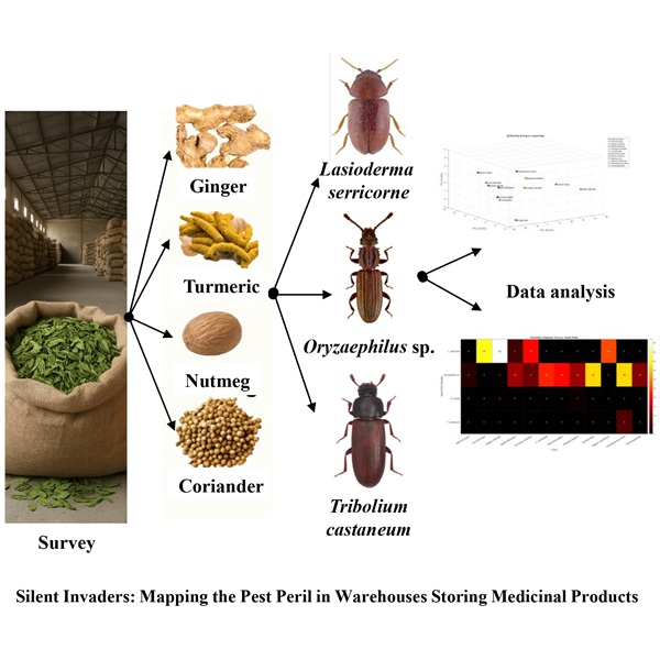 A structured survey-based study was conducted to assess storage conditions, pest infestations and management strategies in medicinal crop produce storage warehouses. Data were collected from ten warehouse locations across Tamil Nadu through structured questionnaires and direct observations. The warehouses, specializing in storing medicinal plant parts such as seeds, roots, leaves and bark, were analyzed based on storage capacity, duration and environmental conditions, including temperature and humidity levels. Pest infestations were documented by identifying species diversity, infestation rates and seasonal trends. Infestation levels were categorized as low, moderate, or high, with data on estimated storage losses. Pest control measures were assessed, including preventive approaches like sanitization, ventilation and humidity control, as well as curative strategies using synthetic insecticides, fumigants and botanical-based pest management solutions. The collected data were pre-processed in MATLAB, utilizing Principal Component Analysis (PCA) and K-means clustering to identify significant infestation patterns. PCA results indicated that the first two principal components captured most of the variance in pest associations, with certain crops such as Curcuma longa (turmeric) and Zingiber officinale (ginger) showing high susceptibility to Lasioderma serricorne, whereas Myristica fragrans (nutmeg) exhibited infestations from multiple pests, including Sitophilus oryzae and Oryzaephilus sp. K-means clustering identified distinct groupings of medicinal crops based on pest infestations, highlighting the need for tailored pest management strategies. A heat map analysis further confirmed that L. serricorne and Oryzaephilus sp. posed the greatest threats to specific medicinal crops, emphasizing the importance of targeted pest mitigation efforts. The hierarchical clustering of medicinal crops suggested shared susceptibility patterns, reinforcing the necessity for customized interventions. These findings provide crucial insights for optimizing storage conditions, improving pest management practices and reducing post-harvest losses in medicinal crop warehouses.