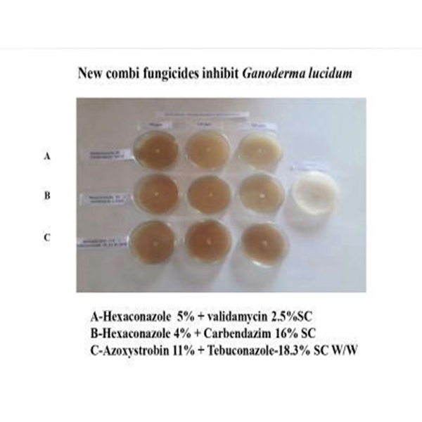 Basal stem rot (BSR) disease, a lethal disease of coconut crop, induced by Ganoderma lucidum is prevalent and endemic in the East Coast region of the Tamil Nadu. The prolonged use of a single fungicide and the emerging issue of fungicide resistance raised concerns regarding disease control in this region. An integrated disease management strategy, incorporating new generation fungicides could help resolve these challenges. The Indian Council of Agricultural Research-AICRP on Plantation Crops (All India Co-ordinated Research Project) investigated different fungicides of single along with combination types against G. lucidum at three different concentrations (100, 250 and 500 ppm) in an in vitro study. Thirteen fungicides were screened and was found that hexaconazole 4 % + carbendazim 16 % SC, hexaconazole 5 % + validamycin 2.5 % SC as well as azoxystrobin 11 % + tebuconazole 18.3 % SC W/W were most effective in controlling G. lucidum even at lower concentrations. In field trial, two novel combination fungicides azoxystrobin 11 % + tebuconazole-18.3 % SC W/W and hexaconazole 5 % + validamycin 2 % SC, were utilized. In comparison to other treatments, treatment (T6), which consists of root feeding hexaconazole 5 % + validamycin-2.5 % SC @ 4 mL in 100 mL of water as well as drenching the soil with hexaconazole 5 % + validamycin-2.5 % SC @ 2 mL/L (15 L/palm) every three months, was the most successful in controlling the disease. This treatment reduced the BSR disease index by 12.43 % compared to the initial disease index and resulted in a 58.49 % increase in nut yield compared to the control.