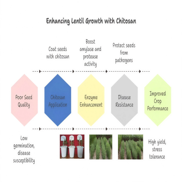 Chitosan, a derivative of chitin, is a natural elicitor known for its biocompatibility, biodegradability and non-toxic properties, offering significant yet underexplored potential in advancing sustainable agriculture. Its application enhances plant physiological responses and mitigates the detrimental effects of both abiotic and biotic stresses across various growth stages. This study evaluated the effects of seed priming with chitosan and chitosan nanoparticles (CNPs) on the germination and seedling development of lentil (Lens culinaris L.). Seeds were primed with varying concentrations of chitosan (0.5 %, 1.0 %, 1.5 % and 2.0 %) and CNPs (50, 100, 150, 200 and 300 ppm). The priming duration was optimized for each treatment based on water uptake kinetics and initial radical emergence. Seed priming with a low concentration of chitosan (0.5 %) significantly improved seedling growth parameters, hydrolytic enzyme activities (amylase, protease), dehydrogenase and phytase activity, as well as yield-associated traits. In contrast, CNPs priming at 200 ppm showed superior enhancement across most laboratory and field parameters. Primed seeds treated with CNPs showed marked improvements, including a 12.6 % increase in germination potential, a 65.9 % increase in root length, a 97.4 % increase in shoot length, a 73 % increase in total seedling length, a 19.7 % rise in seedling dry weight and significant increases in vigor indices (94.8 % and 34.8 %) compared to non-primed seeds. Additionally, hydrolytic enzyme activities, including amylase, protease, dehydrogenase and phytase, were substantially elevated in primed seeds relative to untreated controls. To corroborate these findings, field experiments were conducted to assess the crop performance upon priming. Results revealed that seed priming with chitosan (0.5 %) and CNPs (200 ppm) significantly (P ≤ 0.05) enhanced seedling emergence, field establishment, plant height, pod and seed counts per plant, seed weight, overall yield and harvest index. These findings suggest that seed priming with 0.5 % chitosan or 200 ppm CNPs enhances seedling development, plant growth and yield by improving enzymatic activities and mobilization of food reserves.