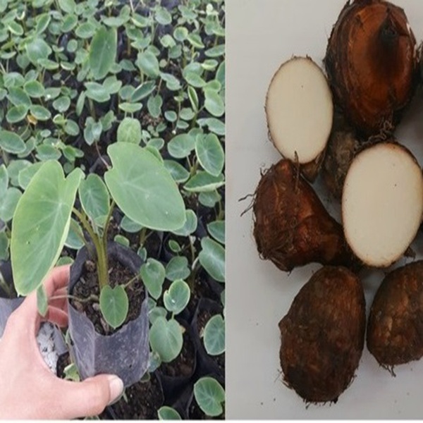 Eddoe taro (Colocasia esculenta (L.) Schott var. antiquorum) is a valuable tuber crop widely cultivated for its starchy corms and cormels, which serve as a rich source of carbohydrates and essential nutrients. However, the optimization of potting media for eddoe taro cultivation in controlled environments has not been fully explored. This study evaluated the effects of five potting substrates on the growth, tuber yield and quality of eddoe taro under nethouse conditions. A completely randomized design was employed with five treatments: Loamy soil (Tre 1), loamy soil + coconut coir (1:1) (Tre 2), loamy soil + TMX mixed soil (1:1) (Tre 3), loamy soil + coconut coir + TMX mixed soil (1:1:1) (Tre 4) and loamy soil + mixed coconut coir (rice husk: rice husk ash: coconut coir, 1:1:5) + TMX mixed soil (1:1:1) (Tre 5). Each treatment consisted of 15 replicates (one plant per pot). Growth parameters such as plant height, leaf number and leaf size were significantly improved in treatments containing TMX mixed soil (Tre 3, 4 and 5) compared to treatments without TMX (Tre 1 and 2). Tre 4 yielded the highest total cormels (37 per plant), marketable tubers (20.5 per plant), corm yield (0.95 kg/m²), cormel yield (8.81 kg/m²) and marketable yield (8.29 kg/m²). Additionally, this treatment produced tubers with superior quality characteristics, including 15.4 % dry matter content and 27.9 mg/g fresh weight of total sugar. These findings demonstrate that loamy soil combined with coconut coir and TMX mixed soil (1:1:1) serves as an optimal substrate for eddoe taro cultivation in pots under controlled environments, offering practical solutions for urban and small-scale farming systems.