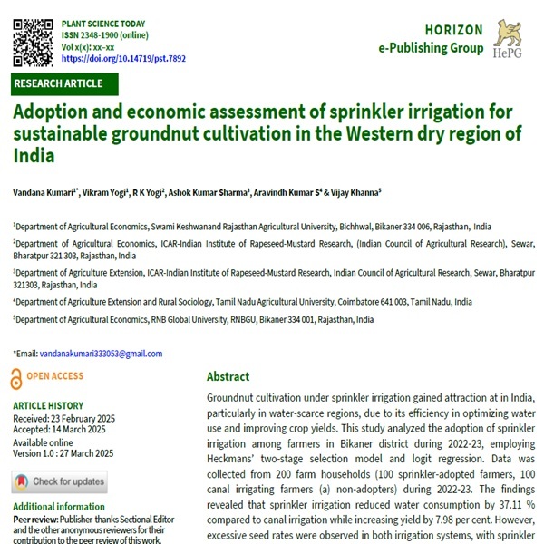 Groundnut cultivation under sprinkler irrigation gained attraction at in India, particularly in water-scarce regions, due to its efficiency in optimizing water use and improving crop yields. This study analyzed the adoption of sprinkler irrigation among farmers in Bikaner district during 2022-23, employing Heckmans’ two-stage selection model and logit regression. Data was collected from 200 farm households (100 sprinkler-adopted farmers, 100 canal irrigating farmers (a) non-adopters) during 2022-23. The findings revealed that sprinkler irrigation reduced water consumption by 37.11 % compared to canal irrigation while increasing yield by 7.98 per cent. However, excessive seed rates were observed in both irrigation systems, with sprinkler irrigation fields using 202.86 kg/ha, far exceeding the recommended 110-125 kg/ha. This unnecessary input led to higher seed costs, highlighting the need for awareness campaigns on optimal seed usage. Cost analysis showed that while total variable costs were higher for sprinkler irrigation (Rs. 105356.07/ha) than canal irrigation (Rs. 93958.49/ha), net income was significantly higher (Rs. 84156.54/ha vs. Rs. 44008.43/ha). Education, access to credit and farm size significantly influenced adoption, with educated farmers being four times more likely to adopt. Despite the benefits, high initial investment costs remained a barrier. Policy interventions, including improved credit access and awareness of PMKSY subsidies, were essential for promoting sprinkler irrigation and ensuring sustainable groundnut cultivation in India.