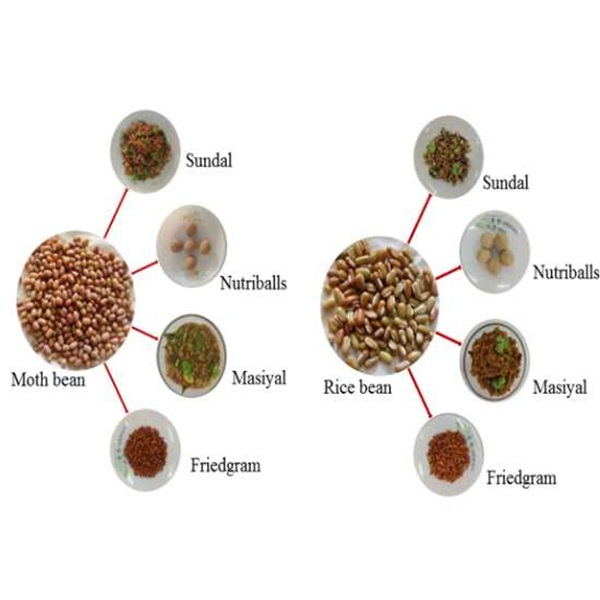 Underutilized pulses have significant potential for enhancing food and nutritional security while contributing to agricultural development. Quality assessment and value addition are important to promote underutilized pulses in an effective way. This study evaluated the physical, cooking, nutritional and phytochemical profiles of moth bean and rice bean. The bulk density of moth bean and rice beans were found to be 892 kg/m3 and 846 kg/m3, respectively. The cooking time for unroasted moth bean was 60 min and for roasted moth bean it was nearly half the time reduced (≈35 min). Roasting of pulses had significant reduction of cooking time. Both moth bean and rice bean exhibited a favorable nutritional profile, with protein contents of 20.63 g/100g and 19.28 g/100g respectively. The fat content was less than 1 g in both pulses while fiber content was at 5.6 % for moth bean and 4.32 % for the rice bean. The phytochemicals such as phytic acid, tannins and saponins were present in both pulses. Moth bean and rice bean are highly suitable for the preparation of regular pulse based recipes and products with commercial value as well. Nutrimix prepared using underutilized pulses were highly acceptable by semi-trained panel of sensory evaluation with a shelf life of two months and is suitable for commercial production.