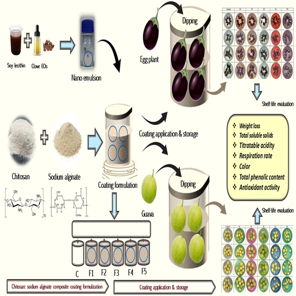 In the present study, effects of chitosan-sodium alginate composite coatings functionalized with clove-soy lecithin nanoemulsion were investigated on the postharvest shelf life and quality characteristics of guava and eggplant fruits at room storage condition (23±3 °C, RH- 60-65 %). The postharvest characteristics such as weight loss, acidity, TSS, respiration rate, antioxidant activity and visual appearance of the fruits were determined up to 12 days of storage. The results revealed that the application of chitosan-sodium alginate composite effective to maintained higher postharvest characteristics of guava and eggplant fruits as compared to control and coating with alone chitosan and sodium alginate. The F3 (50:50, chitosan-sodium alginate) composite coating was found most significant with retarded the weight loss in guava and eggplant. On 12 days of storage, the significantly (p>0.05) lower weight loss (9.24 %, 10.9 %), respiration rate (22.48 mg CO2kg-1h-1, 18.78 mg CO2kg-1h-1), total soluble solids (9.87°Brix, 4.96 °Brix) with higher maintained of titratable acidity (0.49 %, 0.36 %), antioxidant activity (53.745 %, 33.09 %) and total phenolic content (129.74 mg/100g, 49.09 mg/100g), respectively was found in guava and eggplants fruits treated with F3 composite coating formulation followed by F4 and F2 coating formulations. The control (distilled water) samples showed higher weight loss (18.02 %, 21.84 %), TSS (10.78 °Brix, 5.78°Brix), with lower values of acidity (0.29 %, 0.22 %), antioxidant (39.12 %, 23.01 %) and total phenolic content (89.64 mg/100 g, 32.86 mg/100 g), respectively in both guava and eggplant fruits, respectively.