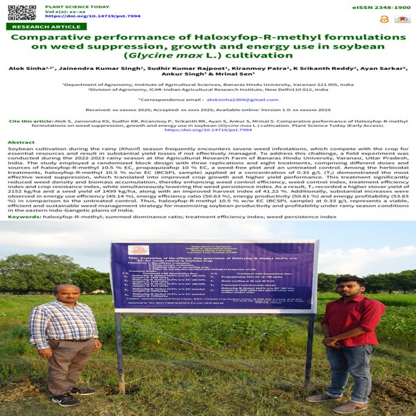 Soybean cultivation during the rainy (Kharif) season frequently encounters severe weed infestations, which compete with the crop for essential resources and result in substantial yield losses if not effectively managed. To address this challenge, a field experiment was conducted during the 2022-2023 rainy season at the Agricultural Research Farm of Banaras Hindu University, Varanasi, Uttar Pradesh, India. The study employed a randomized block design with three replications and eight treatments, comprising different doses and sources of haloxyfop-R-methyl 10.5 % EC, propaquizafop 10 % EC, a weed-free plot and an untreated control. Among the herbicidal treatments, haloxyfop-R-methyl 10.5 % w/w EC (BCSPL sample) applied at a concentration of 0.33 g/L (T3) demonstrated the most effective weed suppression, which translated into improved crop growth and higher yield performance. This treatment significantly reduced weed density and biomass accumulation, thereby enhancing weed control efficiency, weed control index, treatment efficiency index and crop resistance index, while simultaneously lowering the weed persistence index. As a result, T3 recorded a higher stover yield of 2152 kg/ha and a seed yield of 1499 kg/ha, along with an improved harvest index of 41.22 %. Additionally, substantial increases were observed in energy use efficiency (49.14 %), energy efficiency ratio (50.63 %), energy productivity (50.81 %) and energy profitability (53.83 %) in comparison to the untreated control. Thus, haloxyfop-R-methyl 10.5 % w/w EC (BCSPL sample) at 0.33 g/L represents a viable, efficient and sustainable weed management strategy for maximizing soybean productivity and profitability under rainy season conditions in the eastern Indo-Gangetic plains of India.