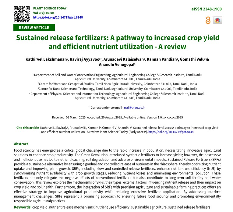 Food scarcity has emerged as a critical global challenge due to the rapid increase in population, necessitating innovative agricultural solutions to enhance crop productivity. The Green Revolution introduced synthetic fertilizers to increase yields; however, their excessive and inefficient use has led to nutrient leaching, soil degradation and adverse environmental impacts. Sustained Release Fertilizers (SRFs) provide a sustainable alternative by ensuring a gradual and controlled release of nutrients in the rhizosphere, thereby optimizing nutrient uptake and improving plant growth. SRFs, including slow and controlled-release fertilizers, enhance nutrient use efficiency (NUE) by synchronizing nutrient availability with crop growth stages, reducing nutrient losses and minimizing environmental pollution. These fertilizers not only mitigate the negative effects of conventional fertilizers but also contribute to long-term soil fertility and water conservation. This review explores the mechanisms of SRFs, their types, external factors influencing nutrient release and their impact on crop yield and soil health. Furthermore, the integration of SRFs with precision agriculture and sustainable farming practices offers an effective strategy to improve agricultural productivity while reducing excessive fertilizer application. By addressing nutrient management challenges, SRFs represent a promising approach to ensuring future food security and promoting environmentally responsible agricultural practices.