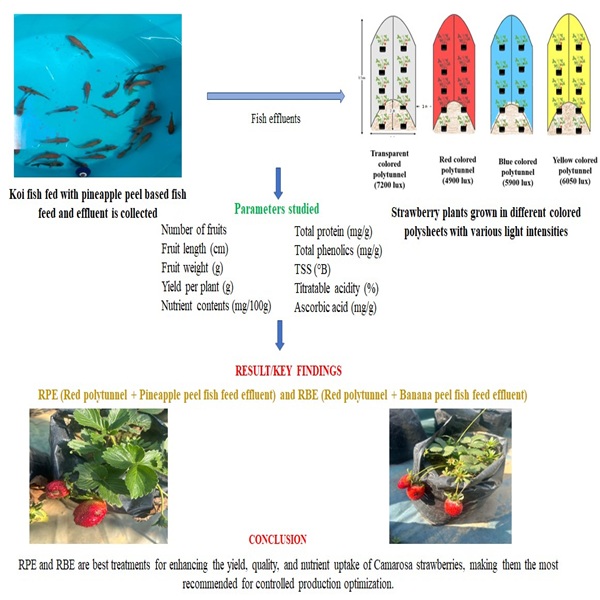 The rising demand for sustainable, high-yield strawberry production calls for innovative practices that enhance growth and resource efficiency. Open-field cultivation exposes plants to environmental fluctuations, resulting in inconsistent growth, lower yield and reduced fruit quality. The current study investigates the synergistic impact of varying polytunnel colors (transparent, red, blue and yellow) and fish effluent irrigation on Camarosa strawberry plants. Twelve treatments were associated with the study and observation of yield and biochemical parameters were performed in November 2023-2024 at the Agricultural Farm of Lovely Professional University, Phagwara, Punjab, India. The results indicated that RPE (Red polytunnel + Pineapple peel fish feed effluent) exhibited the highest effects on fruit length (6.51 cm), fruit weight (23.33 g) and yield per plant (500.87 g). However, the lowest effect was recorded in TW (Transparent polytunnel + Absolute water irrigation). Similarly, for fruit quality attributes, RPE and RBE (Red polytunnel + Banana peel fish feed effluent) showed better results. Treatments based on red polytunnel i.e., RPE and RBE showed the highest nutrient uptake resulting in improved physiological performance and enhanced fruit quality and yield. Multivariate analysis helped in visualizing the data and its interpretation. Also, Pearson’s correlation measured the strength and direction of individual treatments and variables which showed the direct and indirect effects of variables. Thus, the study concludes that treatments RPE and RBE are best treatments for enhancing the yield, quality and nutrient uptake of Camarosa strawberries making them the most recommended for controlled production optimization.