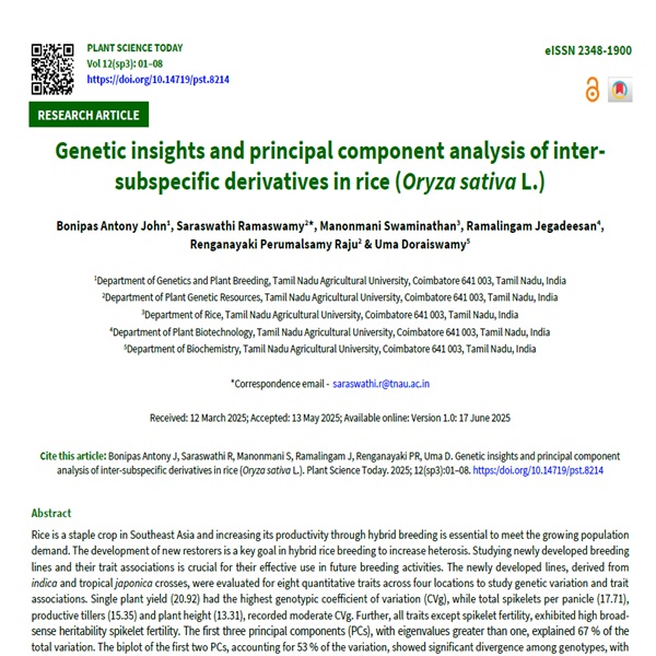 Rice is a staple crop in Southeast Asia and increasing its productivity through hybrid breeding is essential to meet the growing population demand. The development of new restorers is a key goal in hybrid rice breeding to increase heterosis. Studying newly developed breeding lines and their trait associations is crucial for their effective use in future breeding activities. The newly developed lines, derived from indica and tropical japonica crosses, were evaluated for eight quantitative traits across four locations to study genetic variation and trait associations. Single plant yield (20.92) had the highest genotypic coefficient of variation (CVg), while total spikelets per panicle (17.71), productive tillers (15.35) and plant height (13.31), recorded moderate CVg. Further, all traits except spikelet fertility, exhibited high broad-sense heritability spikelet fertility. The first three principal components (PCs), with eigenvalues greater than one, explained 67 % of the total variation. The biplot of the first two PCs, accounting for 53 % of the variation, showed significant divergence among genotypes, with plant height contributing most, followed by single plant yield and spikelet fertility. Spikelet fertility (0.44) and the total number of spikelets per panicle (0.25) showed a strong correlation with single plant yield in the combined analysis and across locations, making them promising traits for selection. Thus, greater emphasis must be placed on spikelet fertility and the number of spikelets per panicle when selecting inter-subspecific cross derivatives. The newly developed inter-subspecific breeding lines in the present study showed significant variation in yield and other traits, making them valuable resources for heterosis breeding.