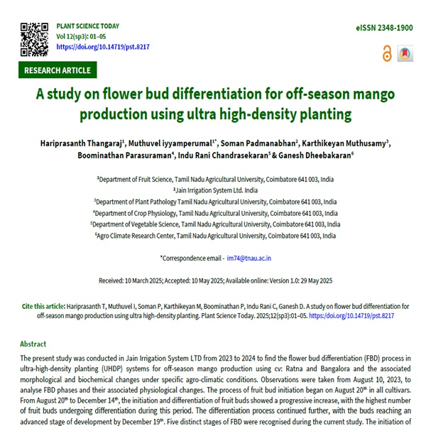 The present study was conducted in Jain Irrigation System LTD from 2023 to 2024 to find the flower bud differentiation (FBD) process in ultra-high-density planting (UHDP) systems for off-season mango production using cv: Ratna and Bangalora and the associated morphological and biochemical changes under specific agro-climatic conditions. Observations were taken from August 10, 2023, to analyse FBD phases and their associated physiological changes. The process of fruit bud initiation began on August 20th in all cultivars. From August 20th to December 14th, the initiation and differentiation of fruit buds showed a progressive increase, with the highest number of fruit buds undergoing differentiation during this period. The differentiation process continued further, with the buds reaching an advanced stage of development by December 19th. Five distinct stages of FBD were recognised during the current study. The initiation of FBD was started in the second week of August, reaching its peak by the second week of December and concluding by the third week of December. During the progression of FBD, a significant increase in the total carbohydrate fraction (%) and C/N ratio was recorded, with the C/N ratio peaking at the maximum differentiation stage. Conversely, the total nitrogen fraction (%) exhibited a consistent decline, reaching its lowest at the peak FBD stage. The findings provide critical insights into optimizing UHDP practices for enhancing off-season mango flowering and production in the selected cultivars.