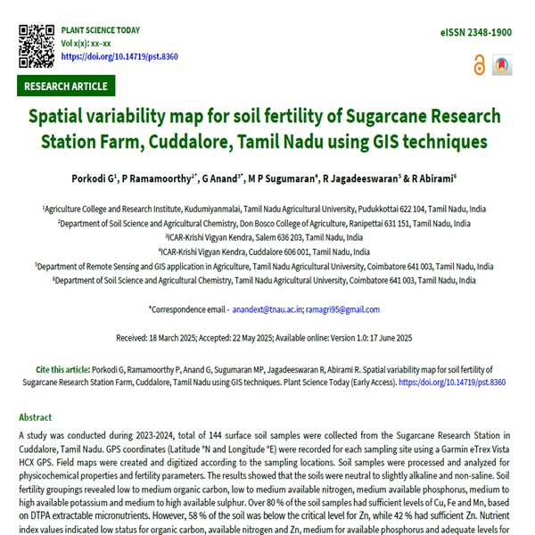 A study was conducted during 2023-2024, total of 144 surface soil samples were collected from the Sugarcane Research Station in Cuddalore, Tamil Nadu. GPS coordinates (Latitude °N and Longitude °E) were recorded for each sampling site using a Garmin eTrex Vista HCX GPS. Field maps were created and digitized according to the sampling locations. Soil samples were processed and analyzed for physicochemical properties and fertility parameters. The results showed that the soils were neutral to slightly alkaline and non-saline. Soil fertility groupings revealed low to medium organic carbon, low to medium available nitrogen, medium available phosphorus, medium to high available potassium and medium to high available sulphur. Over 80 % of the soil samples had sufficient levels of Cu, Fe and Mn, based on DTPA extractable micronutrients. However, 58 % of the soil was below the critical level for Zn, while 42 % had sufficient Zn. Nutrient index values indicated low status for organic carbon, available nitrogen and Zn, medium for available phosphorus and adequate levels for available sulphur. For micronutrients, DTPA-Mn was adequate, DTPA-Cu and Fe were high and DTPA-Zn was marginal. Thematic maps showed spatial variability across the station. To sustain soil fertility, deficiencies in areas with poor fertility should be addressed using organic or inorganic amendments. Following soil test-based fertilizer and micronutrient recommendations is essential for improving nutrient availability and maintaining soil health for sustainable crop production.
