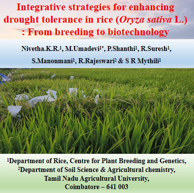 Drought stress is a critical abiotic factor limiting rice (Oryza sativa L.) productivity, posing a significant challenge to global food security. Given the increasing frequency and severity of drought events due to climate change, developing drought-tolerant rice varieties has become a major research priority. Conventional breeding strategies and marker assisted selection (MAS) have been widely used to improve drought resilience in rice. These approaches focus on incorporating key traits like deep rooting, osmotic adjustment and efficient water use. Advances in molecular techniques, such as genomic selection, quantitative trait loci (QTL) mapping and CRISPR/Cas-based gene editing, allow precise genetic modifications to improve drought tolerance. Omics technologies such as genomics, proteomics and metabolomics have facilitated the identification of drought-responsive genes, regulatory pathways and adaptation mechanisms. Agronomic practices such as alternate wetting and drying (AWD), in combination with nanotechnology-based interventions, contribute to sustainable drought stress mitigation and water management. Additionally, multi-omics approaches and big-data analytics accelerate trait discovery and deployment, enabling the development of climate-resilient rice varieties. Addressing the complexity of drought tolerance requires an integrative approach that combines advanced breeding, genetics, plant physiology and sustainable agronomic practices to ensure food security and mitigate the impact of drought on rice production.