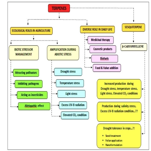 Terpenes are the largest class of plant secondary metabolites which play a major role in plant-environmental interactions and serve vital ecological and agricultural functions. Their volatile nature plays a crucial role in pollination and insect attraction by emitting chemical signals that lure pollinators and seed dispersers, while simultaneously repelling herbivores and attracting the predators of the pests. Terpenes exhibit strong antimicrobial and antiviral activities, making them highly effective against pathogens. The insecticidal activity of terpenes offers an effective and eco-friendly alternative to synthetic pesticides, helping to kill pests in an environmentally sustainable manner. Allelopathic interactions of terpenes suppress the germination and growth of weeds and offer sustainable weed management. Besides, terpene biosynthesis in plants is influenced by abiotic stresses such as drought, elevated temperature, light stress and UV radiation highlighting the critical role in defense and adaptation mechanisms in relation to environmental changes. β-caryophyllene, a sesquiterpene is crucial for pollination, pest management, pathogen resistance, allelopathy and stress tolerance, enhancing survival and sustainability of plants. Modulation of terpene levels due to climate change emphasize their role in improving plant resilience to changing environments. The involvement of terpenes in diverse biotic and abiotic interactions underscores the need for continued research to harness their sustainable applications in agriculture, ecology and beyond.