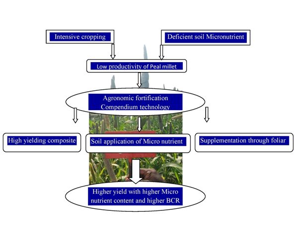Field level experiment was conducted at the Agricultural College and Research Institute, Madurai, Tamil Nadu Agricultural University (TNAU), India during the rabi season of 2022 and 2023. The objective was to develop a compendium technology to enhance iron (Fe) and zinc (Zn) content, enhance the yield in pearl millet through agronomic fortification using a Factorial Randomized Block Design. The study involved a bio-fortified hybrid (ICMH 1202) and CO 10 of TNAU variety, with three replications. The treatments included soil application of Zn in chemical and microbial forms, their combination and supplementation of Zn and Fe in chemical form through foliar with the combination of CO 10 and ICMH 1202. The results revealed that cultivation of CO 10 with ZnSO4 at 25 kg ha-1 (100 % recommended dose) applied to the soil, combined with foliar supplementation of 0.5 % of ZnSO4), 0.5 % of FeSO4 and nano-urea (@ 2 mL L-1 of water), in combination with other agronomic practices, achieved higher yield (3245 kg ha-1), net income (Rs. 42155 ha-1) and BCR of 2.18. This treatment also recorded Fe content of 119.85 ppm and Zn content of 39.29 ppm. Similarly, cultivation of ICMH 1202 under the same treatment achieved a yield of 2917 kg ha-1 and recorded higher Fe (178.11 ppm) and Zn (49.76 ppm) content in the grain. Increasing Zn and Fe application levels enhanced their total content in pearl millet grains. External application of Zn and Fe is essential for achieving optimal nutrient levels in bio-fortified hybrids, particularly under micronutrient-deficient soil conditions.