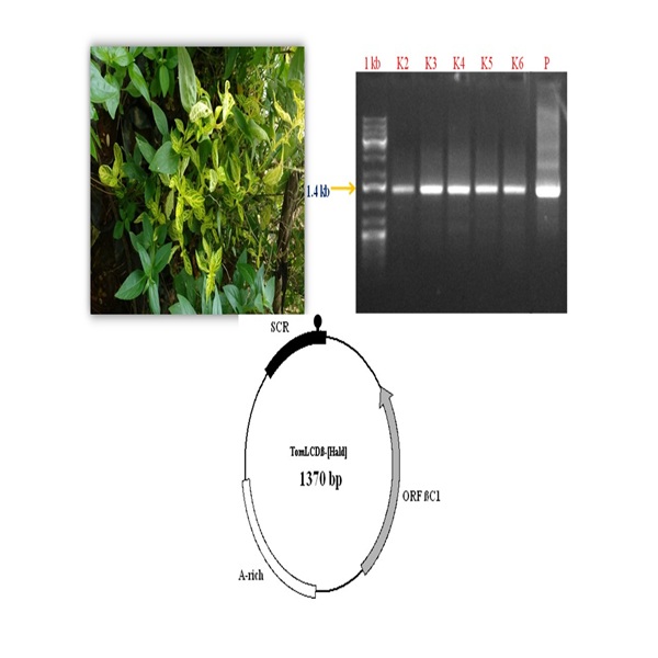 Kalmegh (Andrographis paniculata) is an important medicinal plant growing in the Southeast Asia. Recent initiatives have been undertaken by various agencies to promote its cultivation. Symptoms such as leaf curling, yellowing of vein and clearing were observed on Kalmegh plants in Bhubaneshwar, Odisha. To identify the causal virus, DNA extracted using the CTAB method and subjected to PCR amplification using primers targeting the coat protein gene, DNA-A and the associated betasatellite. The coat protein gene, DNA-A component and betasatellite were successfully amplified, cloned and sequenced. The sizes of the begomovirus DNA-A and betasatellite components were approximately 2.7 kb and 1.4 kb respectively. The nucleotide sequence shared highest identity (89 %) with Andrographis yellow vein leaf curl virus (AYVLCV) isolate- 64 (KM359406). The associated betasatellite showed 95 % sequence similarity with AYVLC betasatellite (KC9672282, KM359409). The analysis identified three key structural elements: the satellite conserved region (SCR), an adenine (A)-rich region and the open reading frame (ORF) ßC1. The present investigation characterizes the leaf curl virus and the associated satellite DNA molecule, which will pave the way for further research for reliable diagnosis, epidemiology and durable management strategies.