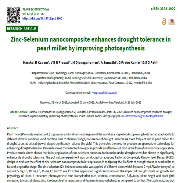 Pearl millet (Pennisetum glaucum L.) is grown in arid and semi-arid regions of the world as a staple food crop owing to its better adaptability to different climatic conditions and nutrition. Due to climate change, occurrence of drought is becoming more frequent and in pearl millet, this drought stress at critical growth stages significantly reduces the yield. This generates the need to produce an appropriate technology for enhancing drought tolerance. Research shows that nanotechnology can provide an effective solution in the form of nanoparticle application. Previous studies have shown that foliar application of zinc-selenium quantum dot in maize under drought stress has shown to significantly enhance its drought tolerance. The pot culture experiment was conducted by adopting Factorial Completely Randomized Design (FCRD) design to evaluate the effect of zinc-selenium nanocomposite foliar application in mitigating the ill effects of drought stress in pearl millet at its peak vegetative stage. The zinc-selenium (Zn-Se) nanocomposite was applied at different doses which included 0 mg L-1 (water sprayed) as control, 5 mg L-1, 10 mg L-1, 15 mg L-1 and 20 mg L-1. Foliar application significantly reduced the impact of drought stress on growth and physiology of plant. It enhanced photosynthetic rate, transpiration rate, stomatal conductance, Fv/Fm ratio, plant height and plant girth compared to control plants. Also it reduces leaf temperature and F0 values in sprayed plants as compared to control. The study indicates that zinc-selenium nanocomposite at 20 mg L-1 was most effective in mitigating drought stress. Hence it can be concluded that foliar application of zinc-selenium nanocomposite at 20 mg L-1 can effectively enhance drought tolerance by stabilizing the photosynthesis associated traits thereby reducing the effect of drought stress in pearl millet at its peak vegetative stage.