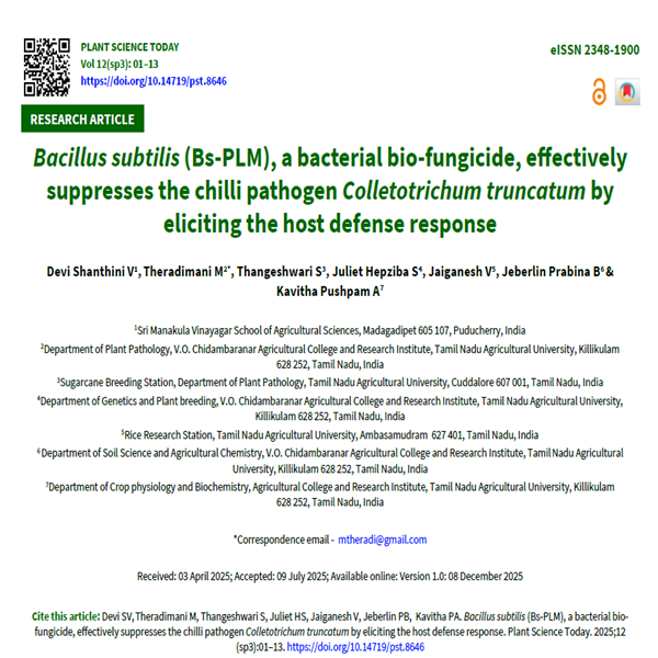 The present study was conducted to evaluate the efficacy of the bacterial bio-fungicide Bacillus subtilis against Colletotrichum truncatum, the causal agent of anthracnose and fruit rot in chilli (Capsicum annuum L.). A total of 10 Bacillus spp. isolates were obtained from the rhizosphere soil of major chilli-growing regions in Tamil Nadu, India. Characterisation through various methods, including molecular analysis, confirmed that these isolates belonged to the Bacillus genus. Additionally, molecular and in vitro screening identified Bacillus subtilis (Accession No. MZ618269) and Bacillus cereus (Accession No. MZ618270) as highly effective in inhibiting C. truncatum. Furthermore, PCR analysis revealed that Bacillus spp. isolates Bs-PLM and Bc-ADP possessed the genes responsible for the synthesis of the antibiotics iturin and surfactin. GC–MS analysis indicated that these isolates produced more than 30 antimicrobial compounds at different retention times, with the most notable antifungal compounds being n-Nonadecanol-1, 1-Hexadecanol, Behenic alcohol and Dibutyl phthalate. The volatile compounds released by Bs-PLM and Bc-ADP exhibited the highest mycelial growth inhibition. Under in vivo conditions, fruit lesion areas were significantly reduced when pathogen-inoculated fruits were treated with volatiles produced by these Bacillus strains compared to the untreated control fruits. Therefore, the Bacillus spp. could be used for the effective management of anthracnose and fruit rot disease in chillies.