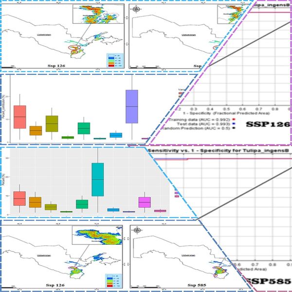 Bioclimatic modeling is an essential tool for predicting species distributions under changing environmental conditions. T. fosteriana and T. ingens, rare and endemic tulip species in Uzbekistan, are currently facing increasing threats from habitat loss and climate change. Understanding their potential range under current and future climate scenarios is crucial for conservation planning. The present study employed Maximum Entropy (MaxEnt) modeling to assess the habitat suitability of T. fosteriana and T. ingens using occurrence data from field surveys, herbarium records and biodiversity databases. Environmental predictors included climatic, soil and topographical variables. Model accuracy was evaluated using the Area Under the Curve (AUC) and future habitat projections were generated under Ssp126 (moderate emissions) and Ssp585 (high emissions) scenarios for 2041-2060. The results suggest that T. fosteriana may expand its range, particularly in the Hissar and Bobotog mountain ranges, while T. ingens is projected to suffer severe habitat reduction, losing over 90 % of its suitable areas under the high-emission scenario. The most influential environmental variables were precipitation in the coldest quarter and depth to bedrock, highlighting the role of moisture availability and soil structure in habitat suitability. High AUC values (above 0.98) confirm model robustness. These findings emphasize the contrasting responses of the two species to climate change. While T. fosteriana may benefit from rising temperatures, T. ingens is at high risk of habitat loss, requiring urgent conservation efforts. This study provides valuable insights for biodiversity management in Central Asia, highlighting the need for protected areas, in-situ conservation and potential ex-situ preservation strategies.