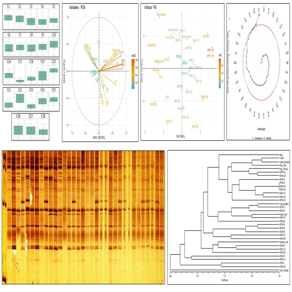 Pumpkin (Cucurbita moschata Duch. Ex Poir.) is incredibly useful and nutritionally rich vegetable crop having numerous industrial uses regarding seed, flesh and flesh flour, but it is still underutilized in India. Hence, it is necessary to introduce some potential selections with high yield and nutrition content. The present investigation was elucidated the morpho-nutritional potential of pumpkin for 28 morpho-biochemical characters estimated and assessment of molecular diversity using Simple Sequence Repeats (SSR) and Sequence-Related Amplified Polymorphism (SRAP) marker in 34 diverse genotypes of pumpkin collected from different regions of India. The study was conducted at the Main Vegetable Research Station, Anand Agricultural University (AAU), Anand, during the kharif season of 2018. PCA explained 82.72 % total variation across traits, while multi-trait genotype-ideotype distance index (MGIDI) identified three high-performing genotypes; Anand Pumpkin 1, GPPK 95 and GPPK 59. A set of five SSR and SRAP polymorphic primers were used to estimate genetic diversity among the genotypes. The similarity matrix generates dendrogram with UPGM based on Jaccard’s coefficient implemented in NTYSIS. The clustering grouped 34 genotypes into six main clusters viz. I, II, III, IV, V and VI with 25, 4, 1, 1, 2 and 1 genotypes, respectively. The maximum genetic distance (0.75) was recorded between the genotype pairs GPPK 59 and Arka Chandan, as well as GPPK 90 and Arka Chandan. These findings highlight the potential of specific genotypes for breeding programs aimed at enhancing yield and nutritional value in pumpkin.