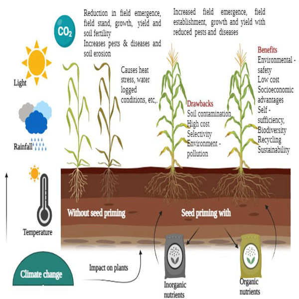 Climate change is a major global concern that adversely affects seedling emergence and crop development during critical growth stages. Thus, as a preventive measure and short-term strategy, seed priming is performed to boost germination and early growth of plants. Chemical seed priming has drawbacks, including high cost, selectivity and impact on target species, soil contamination and environmental pollution. Although plant genetic engineering, has advanced significantly developing resistant varieties remains a slow and unpredictable process. Technological advancements have created a path for future research on the improvement of current environment friendly seed enhancement methods with assured enhancement in seed vigour and crop productivity. Hence, organic seed priming serves as substitute due to their socioeconomic benefits and environmental safety. It represents an agro-ecological approach grounded in the principles of self-sufficiency, biodiversity, recycling and reduced dependency on chemical inputs. Soon, the organic seed priming is expected to exhibit fastest growth in the seed industry, partly due to its ease of registration with the environment regulatory agencies. Therefore, this reviews a few highlights preferred organic seed priming techniques, recent advancements and their significance in sustainable agriculture.