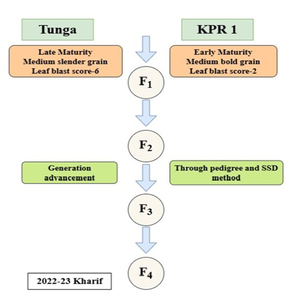 Micronutrient enrichment and desirable grain quality are crucial targets in rice improvement to address malnutrition and enhance consumer acceptance. The present study was conducted to evaluate the performance of segregating lines of cross, Tunga x KPR 1 in an augmented design during Kharif 2022 - 23 at the Zonal Agricultural and Horticultural Research Station (ZAHRS), Mudigere to investigate genetic variability parameters, correlation, direct and indirect effects and grain quality parameters. The analysis of variance (ANOVA) revealed significant phenotypic and genotypic differences for all the studied characters. High values of phenotypic coefficient of variation (PCV) and genotypic coefficient of variation (GCV) were for the number of filled grains per panicle (NFG; 20.39 and 20.03 % respectively). Moderate PCV and GCV values were recorded for grain yield per plant (GY; 16.39 %, 11.29 %) and spikelets per panicle (SP; 15.28 %, 14.84 %). Most of the characters recorded minimal differences between PCV and GCV. The NFG showed high heritability values (96.59 %) and high values of genetic advance as a percentage of mean (GAM; 40.62 %). Filled grains per panicle, productive tillers per plant, spikelets per panicle, tillers per plant and panicle length (PL) showed a positive and significant association with grain yield. A positive direct effect on grain yield was observed for days to maturity (DM), productive tillers per plant, panicle length and filled grains per panicle. The top 10 superior lines from the cross were analyzed for quality parameters such as zinc (35.65 ppm), iron (13.92 ppm) and amylose content (28.20). All three traits, zinc (0.37), iron (0.31) and amylose (0.35) have a weak positive correlation and they were found to be promising and can be used in crop improvement programmes. Entry 44,41 and 12 have outperformed all other lines in zinc and iron content respectively.