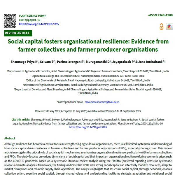 Although resilience has become a critical focus in strengthening agricultural organisations, there is still limited systematic understanding of how social capital drives resilience in farmers collectives and farmer producer organisations (FPOs), especially during crises. This review article investigates the critical role of social capital mechanisms in enhancing organisational resilience, particularly within farmers collectives and FPOs. The study focuses on various dimensions of social capital and their impact on organisational resilience during economic crises such as the COVID-19 pandemic. Based on a systematic literature review analysis using the PRISMA (preferred reporting items for systematic reviews and meta-analyses) framework, the findings indicate that FPOs with strong social capital can effectively mobilize resources, adapt to market disruptions and maintain supply chain operations. The analysis highlights that structural social capital, through networks, enables collective action, cognitive social capital, through shared values and understanding facilitates strategic adaptation and relational social capital, based on trust and reciprocity, strengthens organisational response and internal cohesion. The article also investigates social capital's evolution across the different stages of FPO lifecycle, observing that while social capital is high in early stages, it tends to decline as organisations grow and become more market oriented. The study provides practical recommendations for policymakers and FPO leaders to preserve and enhance social capital, emphasizing the importance of member engagement, shared values and continuous communication. By understanding and leveraging social capital mechanisms, FPOs can build more resilient and sustainable agricultural enterprises that support smallholder farmers' economic and social well-being.
