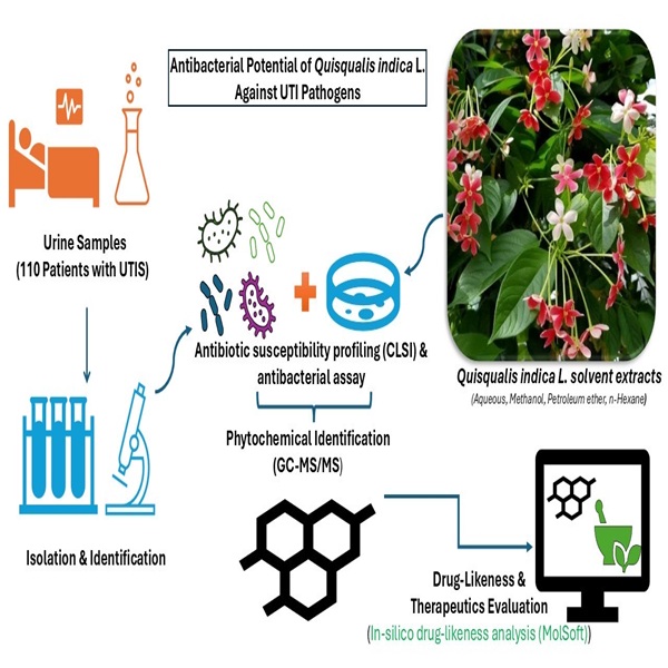 The ornamental plant, Quisqualis indica L. has several pharmacognistic properties. The anti-bacterial activity of the plant extracts against common bacteria causing Urinary tract infections (UTIs) were determined. In this study, Quisqualis Indica L. plant samples were collected during the spring season from Kalahandi District of Odisha. The different solvent extracts of the medicinal plant, Q. indica were used for determining the anti-bacterial activity against human pathogenic micro-organisms isolated from samples of patients having UTIs. In all, urine samples from 110 patients having UTIs were analyzed. Antibiotic susceptibility of gram-positive and gram-negative bacterial isolates was studied. The Molsoft tool was used to identify the drug likeness score of each compound. Escherichia coli was observed in 57 %, Pseudomonas aeruginosa in 17 %, Staphylococcus aureus in 15 % and Klebsiella pneumoniae in 10 % of the samples. Escherichia coli was the most predominant bacteria isolated from UTIs. Seven bacterial strains were used in the study namely Staphylococcus aureus, Escherichia coli, Pseudomonas aeruginosa, Klebsiella pneumoniae, Streptococcus pyogenes and Acinetobacter baumannii. The extracts of Q. indica have significant anti-bacterial properties against Escherichia coli, Staphylococcus aureus, Klebsiella pneumoniae, Pseudomonas aeruginosa, Acinetobacter baumannii and Streptococcus pyogenes causing the UTIs. The compounds mainly Phytol, Trans-sequalene, Tocoferol, Vitamin-E-acetate and stigmasterol have higher drug likeness scores. Our study has reported the structural configuration of the extracts having higher drug-likeness score with a potential for future therapeutic drug against the UTIs. This study focusses on UTIs and the phytochemical analysis has been evaluated with drug likeness score.