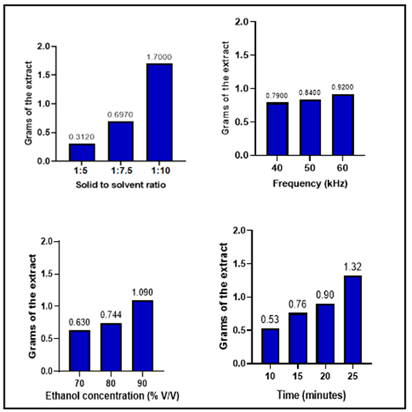 Amaranthus viridis L. belongs to the Amaranthaceae family. It is a rich source of numerous phytochemicals and amino acids. The objective of this work was to optimize Ultrasound-Assisted Extraction (UAE) based on the extraction yield and Thin-Layer Chromatography (TLC) profile under different conditions, to compare the optimized UAE to the Soxhlet extraction method and evaluate the cytotoxic effects of the ethyl acetate fraction of the 80 % ethanolic extract on the SKGT-4 (human esophageal adenocarcinoma), AGS (human gastric adenocarcinoma) and A431 (human epidermoid carcinoma). A one-factor at a time experiment was carefully designed to assess the influence of the following factors on the extraction: time, frequency, solid-to-solvent ratio and aqueous ethanol concentration. Soxhlet extraction using 80 % aqueous ethanol was done for defatted plant material, then fractionation using chloroform, ethyl acetate and n-butanol. Cytotoxicity of ethyl acetate fraction was evaluated using the MTT assay on AGS, A431 and SKGT-4 cell lines. The results indicated that in the UAE, the solid-to-solvent ratio has the most significant effect on yield. Soxhlet extraction proved to be more efficient than UAE in terms of TLC profiles. The cytotoxicity of the ethyl acetate fraction exhibited cytotoxic activity against the tested cell lines in a concentration-dependent manner. Thus, selecting a particular extraction method depends on the target compounds. Soxhlet is preferred for gaining certain compounds that require heat for their extraction. The ethyl acetate fraction showed a cytotoxic effect on various cell lines related to cell components and their interactions with phytochemicals present in this fraction.