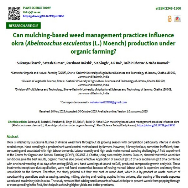 Okra is infested by successive flushes of diverse weed flora throughout its growing season with competition particularly intense in direct-seeded crops. Hand-weeding is a predominant weed control method used by farmers. However, it is very tedious, sometime inefficient, time-consuming and associated with high labour demands. Labour scarcity and high costs make manual weeding challenging. A field experiment at the Center for Organic and Natural Farming (CONF), SKUAST-J, Chatha, using okra variety Jammu Okra-05, showed that while weed-free conditions gave the best results, organic mulches also proved effective. Application of sawdust @ 1.0 t/ha or saccharum @ 5 t/ha combined with one hand weeding at 30 days after sowing (DAS), or 2 hand weedings at 20 and 40 DAS, produced comparable growth and yield. These treatments except saw dust application, were not found economical because of having manual labour which is expensive and many times unavailable to the farmers. Therefore, the study pointed out that saw dust or wood dust, which is a by-product or waste product of woodworking operations such as sawing, sanding, milling, planing and routing, applied in low volume, after sowing of the seeds suppress weeds and maximise yields in okra. The study revealed that adding small amounts of sawdust helps to prevent weeds from popping through or even spreading in the field, that helps in achieving higher yields and better premiums.