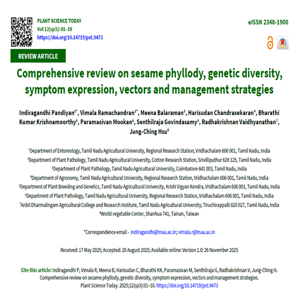 Insect pests and diseases are the major biotic stresses to crop plants. Some are highly dreadful and cause yield loss even up to 100 %. Sesame crop face a serious problem worldwide due to the insect vector-transmitted phytoplasma disease called phyllody. The transmission was facilitated by various leafhoppers (Cicadellidae: Hemiptera). The predominant phytoplasma group infecting the sesame crop is 16SrI and 16SrII in most of the sesame-growing countries. The phytoplasma subgroup 16SrII-D is the most common one in India, Oman, the Republic of Korea, Thailand and Turkey. The leafhopper species, Orosius albicintus vectoring the transmission is replaced with the species Hishimonas phycitis, which is the dominant one in the sesame ecosystem in terms of population and transmission (88.33 %) of the disease. In most of the sesame-growing countries, the symptoms expressed in phytoplasma infected sesame plants are yellowing, virescence, shoot apex fasciation, floral sterility, change in flower color and cracking of capsules. Diversity in the symptoms expression is due to the changes in host plant anatomy, biochemical and physiological changes and variations in the enzymes and phytohormones levels. The effector protein SAP54 is mainly responsible for inducing the phyllody symptoms in phytoplasma infected plants. Since phytoplasma is an obligate pathogen, direct management methods may not be feasible. Targeting the vector population with an integrated pest management strategy would reduce the disease incidence and improve the yield parameters of the sesame crop. In this review, the progress made so far in understanding the phytoplasma infection in sesame, different groups and subgroups of phytoplasma, the diverse symptoms observed in different geographical locations and the management practices followed are discussed comprehensively.