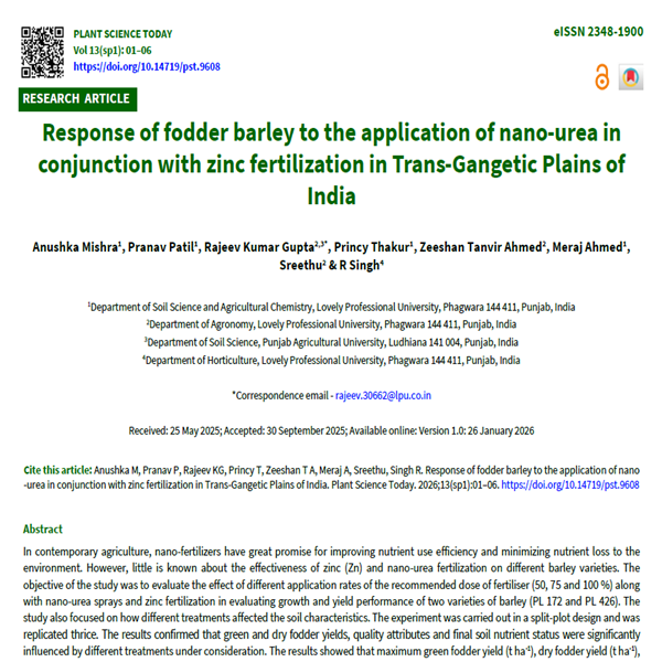 In contemporary agriculture, nano-fertilizers have great promise for improving nutrient use efficiency and minimizing nutrient loss to the environment. However, little is known about the effectiveness of zinc (Zn) and nano-urea fertilization on different barley varieties. The objective of the study was to evaluate the effect of different application rates of the recommended dose of fertiliser (50, 75 and 100 %) along with nano-urea sprays and zinc fertilization in evaluating growth and yield performance of two varieties of barley (PL 172 and PL 426). The study also focused on how different treatments affected the soil characteristics. The experiment was carried out in a split-plot design and was replicated thrice. The results confirmed that green and dry fodder yields, quality attributes and final soil nutrient status were significantly influenced by different treatments under consideration. The results showed that maximum green fodder yield (t ha-1), dry fodder yield (t ha-1), crude protein (%), ash content (%), crude fiber (%) and total carbohydrate content (%) were obtained with PL 172 variety and with the application of 75 % Recommended Dose of Nitrogen (RDN) + two nano-urea sprays + two foliar zinc sprays.