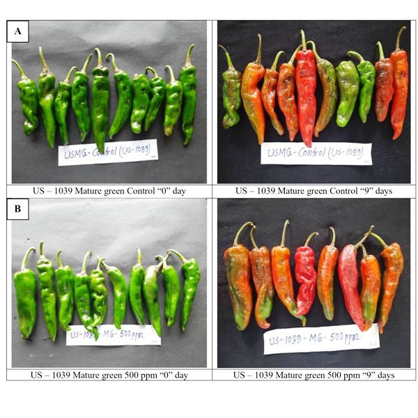 This study was conducted to gain insights into the impact of ethephon on the ripening and quality of paprika fruits (cv. US 1039). Mature green paprika fruits were immersed in different concentrations of an ethephon aqueous solution (500, 1000 and 1500 ppm) for 5 min, then placed in a plastic tray and stored at room temperature. The fruits' physicochemical properties were assessed from the stage of mature green to the point of senescent maturation. Applying the aqueous ethephon solution at 1500 ppm resulted in the highest percentage of ripening. The percentages of both ripening and rotting increased as with increasing ethephon concentration (500−1500 ppm) and with the duration the fruits were allowed to ripen. Although the titratable acidity (TA) of the fruits gradually decreased, the levels of ascorbic acid and lycopene rose as the ripening process continued, irrespective of the treatment used. Fruits harvested at the green mature stage exhibited red colour development by the 9th day following the ethephon solution; however, the rotting rate exceeded 30–35 % by that time, rendering the fruits unmarketable. In the control group, the ripening, firmness, rotting and quality metrics were significantly lower compared to those treated with the aqueous ethephon solution and the fruits did not achieve red colouration.