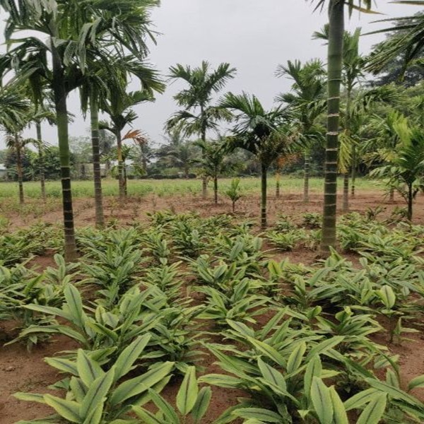 Arecanut (Areca catechu L.) has a lot of unused area in monocropping, which makes medicinal and aromatic plants a good way to increase production. However, there isn't much research on integrated nutrition management in arecanut systems under agroclimatic conditions of Odisha. Hence, a field study was conducted during 2021–22 and 2022–23 in a five-year-old fruit-bearing arecanut plantation (cv. Mohitnagar). The experiment followed a split plot design with three cropping systems as main factor, such as C1: arecanut + Curcuma longa (turmeric) + C. caesia (black turmeric); C2: arecanut + Andrographis paniculata (kalmegh) + Ocimum sanctum (tulsi); C3: arecanut + Withania somnifera (ashwagandha) + Rauvolfia serpentina (sarpagandha). The sub-factor included three nutrient management treatments: N1: organic recycling + 100 % nitrogen (N), phosphorus (P) and potassium (K) through recommended dose of fertilizer (RDF); N2: organic recycling + 100 % NPK through soil test based dose (STD) and N3: organic recycling + 75 % NPK (STD) + biofertilizer consortia. Pooled results over the two-year study showed that organic recycling of biomass with application of 100 % NPK (STD) in the arecanut + ashwagandha + sarpagandha cropping system recorded maximum vegetative growth in terms of plant height, canopy spread and annual leaf production. Meanwhile, cropping system applied with 75 % NPK (STD), biofertilizer consortia and organic recycling of biomass, resulted in highest number of flowering bunch (3.62), fruit set (32.16 %), number of fruits (326.35), fruit weight (48.11 g) and fresh fruit yield (15.13 kg palm-1).