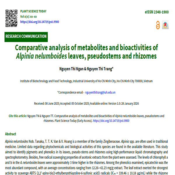 Alpinia nelumboides Nob. Tanaka, T. T. K. Van & V. Hoang is a member of the family Zingiberaceae. Alpinia spp. are often used in traditional medicine. Limited data regarding phytochemicals and biological activities of this species are found in the available literature. This study aimed to identify pigments and phenolics in its leaves, pseudo-stems and rhizomes using high-performance liquid chromatography and spectrophotometry. Besides, free radical scavenging properties of acetonic extracts from the plant were assessed. The levels of chlorophyll a and b in the A. nelumboides leaves were approximately 3 time higher in the rhizomes. Among the phenolics examined, epicatechin was the most abundant compound, with an average concentrations ranging from 12.26—61.23 mg/g extract. The leaf extract exerted the strongest activity to scavenge ABTS (2,2'-azino-bis(3-ethylbenzothiazoline-6-sulfonic acid)) radicals (IC50 = 339.46 ± 10.18 µg/mL) while the rhizome extract showed the most potent capacity to neutralize DPPH (2,2-diphenyl-1-picrylhydrazyl) radicals (IC50 = 149.56 ± 2.37 µg/mL). These results provide a better understanding of the phenolic components of A. nelumboides and its potential health-promoting activities.