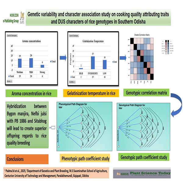 Rice (Oryza sativa L.) is a staple food crop of global importance, with grain quality traits playing a crucial role in consumer preference. Distinctness, Uniformity and Stability (DUS) testing, alongside the evaluation of cooking quality parameters to assess the extent of genetic variability and to determine character association study among cooking attributing traits. So, a study was conducted during the Kharif season (2024-25) at the Post Graduate Research Farm of Centurion University of Technology and Management, Odisha, to evaluate 45 rice genotypes for DUS and cooking quality traits using Randomised Complete Block Design with three replications. Analysis of variances revealed significant variance for kernel length, kernel length after cooking, seed protein content and amylose content. High heritability and high genetic advance as a percentage of the mean (GAM) were noted for all the characters, indicating the presence of additive gene action. Path coefficient analysis revealed that kernel length had the highest positive direct effect on kernel linear elongation ratio, while kernel length after cooking showed a very high negative effect. Positive correlations between kernel linear elongation ratio and seed protein content, amylose content and kernel length affirm their influence. Ketki Joha and Shilkote recorded with maximum kernel breadth and kernel breadth after cooking, respectively. Highest protein content exhibited by Bygon manjira, amylose content raised high for PB1886, kernel linear elongation ratio shown by Nefbi julsi. Kernel length and amylose content emerged as the pivotal, highly heritable traits defining rice cooking quality, offering clear prospects for breeding premium grain quality.