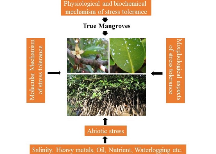 Since mangroves are found near extremely transitional ecosystems, they face a lot of physico-chemical perturbations. As mangroves possess a unique ecotone, they experience many abiotic stressors viz. salinity, metal, oil, humidity temperature, nutrient and a wide range of biotic interactions. Amongst all, salinity is the most important factor affecting mangrove physiology and biochemistry, and thereby regulating the organic matter contribution to the consumers underneath. Exploitation by human, being a dominant biotic interference, is above the rate at which natural replacement of mangrove vegetation occur. Mal-nutrition is a limiting factor in growth and reproduction of many mangroves whereas nutrient replenishment reduces the phytotoxicity of heavy metals. Different environmental pollutants including heavy metals, recalcitrant, cosmetics, petroleum oil and endocrine disrupters have reported impact on various mangroves and associated biota. Stress tolerance in mangroves involves various mechanism including morphological and anatomical features, osmoregulation, water use efficiency, salt secretion, salt exclusion and salt accumulation and molecular regulations. Various aspects of salt tolerance strategies of mangroves related to their growth, biochemical anatomy and physiology were reported by many researchers.