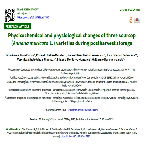 This work aimed to characterize the physicochemical and physiological changes (respiration rate, ethylene production, weight loss, firmness, color, soluble solids, pH, and titratable acidity) of three soursop varieties (GUANAY-1, GUANAY-2, and GUANAY-3) stored at 28 °C ± 1 and 15 °C ± 1. Fruits stored at 28 °C ± 1 reached the highest respiration rate on day seven, while those at 15 °C ± 1 exhibited a delayed climacteric peak. GUANAY-3 showed the lowest weight loss and firmness at 28°C ± 1 (p<0.05), whereas GUANAY-1 demonstrated an extended postharvest life of 11 days at 15°C ± 1, maintaining minimal weight loss and firmness reduction. Across storage temperatures, fruit color progressively darkened as ripening advanced. Soluble solids, pH, and acidity peaked on day seven at 28°C ± 1, coinciding with the climacteric peak. At 15 °C ± 1, these parameters peaked on day nine for GUANAY-1, while GUANAY-2 and GUANAY-3 reached their highest values on day seven. Multivariate analysis revealed that GUANAY-2 and GUANAY-3 shared similar postharvest traits on day five at 28 °C ± 1, while all varieties presented comparable characteristics on days five and seven at 15 °C ± 1. Significant correlations were observed between pH and firmness, as well as weight loss and acidity at both temperatures. GUANAY-3 at 28 °C ± 1 and GUANAY-1 at 15 °C ± 1 exhibit promising potential for national and international markets, improving postharvest management strategies or enhancing marketability.