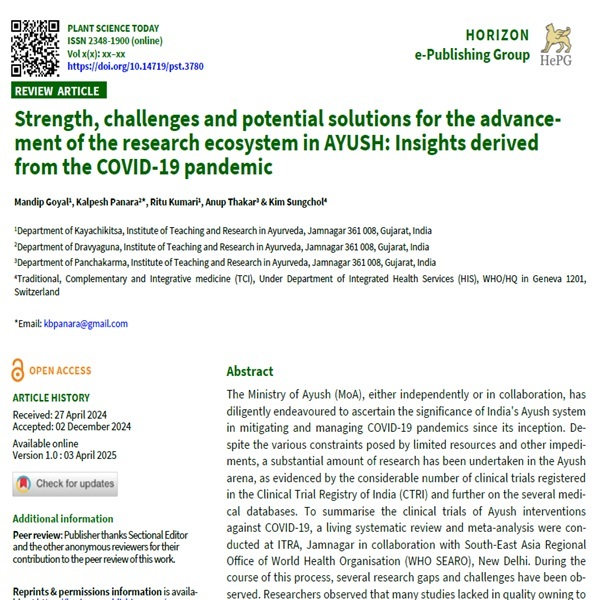 19. Thakar A, Panara K, Goyal M, Kumari R, Sungchol K. AYUSH (Indian System of Medicines) therapeutics for COVID-19: A living systematic review and meta-analysis (First update). Journal of Integrative and Complementary Medicine. 2023;29(3):139–55. https://doi.org/10.1089/jicm.2022.0559