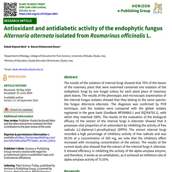 The results of the isolation of internal fungi showed that 70% of the leaves of the rosemary plant that were examined contained one isolation of the endophytic fungi by one fungal colony for each plant piece of rosemary plant leaves. The results of the phenotypic and microscopic examination of the internal fungus isolates showed that they belong to the same species: the fungus Alternaria alternata. The diagnosis was confirmed by PCR technique, and the isolates were compared with the global isolates registered in the gene bank (GenBank MF099865.1 and OQ764793.1), with which they matched 100%. The results of the evaluation of the biological efficacy of the extract of the internal fungi A. alternata showed that it possesses vital properties of an antioxidant by inhibiting the activity of free radicals 2,2-diphenyl-1-picrylhydrazyl (DPPH) The extract internal fungi recorded a high percentage of inhibitory activity of free radicals and was 93.5% at a concentration of 500 mg, we note that the inhibitory effect increased with increasing concentration of the extract. The results of the current study also showed that the extract of the internal fungi A. alternata. It showed efficiency in inhibiting the activity of the alpha-amylase enzyme, and therefore, it works as an antidiabetic, as it achieved an inhibition rate of alpha-amylase activity of 75.55%.