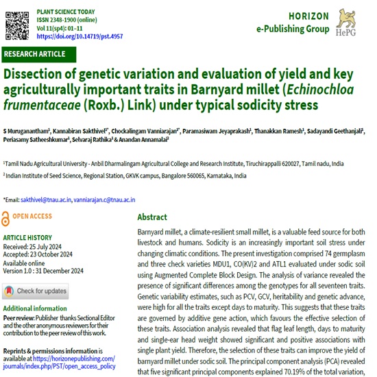 Barnyard millet, a climate-resilient small millet, is a valuable feed source for both livestock and humans. Sodicity is an increasingly important soil stress under changing climatic conditions. The present investigation comprised 74 germplasm and 3 check varieties MDU1, CO(KV)2 and ATL1 evaluated under sodic soil using Augmented Complete Block Design. The analysis of variance revealed the presence of significant differences among the genotypes for all 17 traits. Genetic variability estimates, such as PCV, GCV, heritability and genetic advance, were high for all the traits except days to maturity. This suggests that these traits are governed by additive gene action, which favours the effective selection of these traits. Association analysis revealed that flag leaf length, days to maturity and single-ear head weight showed significant and positive associations with single plant yield. Therefore, the selection of these traits can improve the yield of barnyard millet under sodic soil. The principal component analysis (PCA) revealed that five significant principal components explained 70.19% of the total variation, with the first 2 principal components attributed to 48.99% of variation which are majorly attributed to days to 50% flowering, days to maturity, flag leaf length, plant height, single-ear head weight, number of racemes per panicle and number of tillers. Hierarchical cluster analysis grouped the genotypes into 5 clusters with the accessions in cluster I exhibiting high tillering ability and yield potential. Therefore, the accessions in cluster I can be utilized as parents in the hybridization programme for enhancing the yield of barnyard millet.