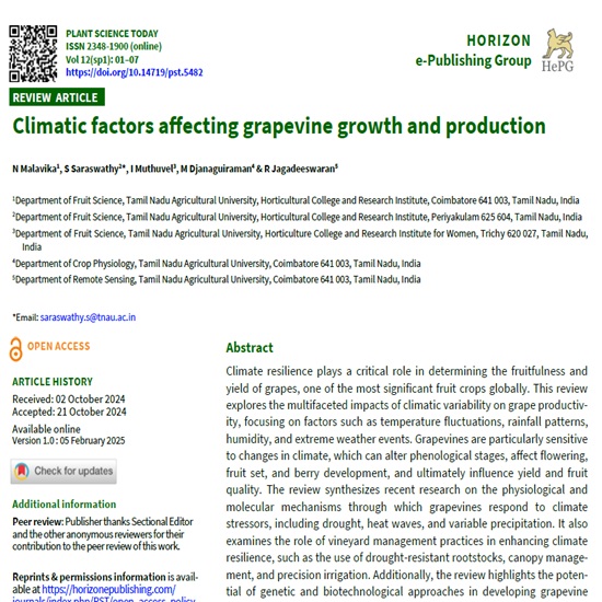 Climate resilience plays a critical role in determining the fruitfulness and yield of grapes, one of the most significant fruit crops globally. This review explores the multifaceted impacts of climatic variability on grape productivity, focusing on factors such as temperature fluctuations, rainfall patterns, humidity, and extreme weather events. Grapevines are particularly sensitive to changes in climate, which can alter phenological stages, affect flowering, fruit set, and berry development, and ultimately influence yield and fruit quality. The review synthesizes recent research on the physiological and molecular mechanisms through which grapevines respond to climate stressors, including drought, heat waves, and variable precipitation. It also examines the role of vineyard management practices in enhancing climate resilience, such as the use of drought-resistant rootstocks, canopy management, and precision irrigation. Additionally, the review highlights the potential of genetic and biotechnological approaches in developing grapevine cultivars with enhanced tolerance to climate stressors. Understanding the complex interactions between climatic factors and grapevine biology is essential for developing strategies to maintain and improve grape yield and quality in the face of climate change. The insights provided by this review will be valuable for grape growers, researchers, and policymakers aiming to mitigate the adverse effects of climate variability and ensure sustainable grape production in the future.