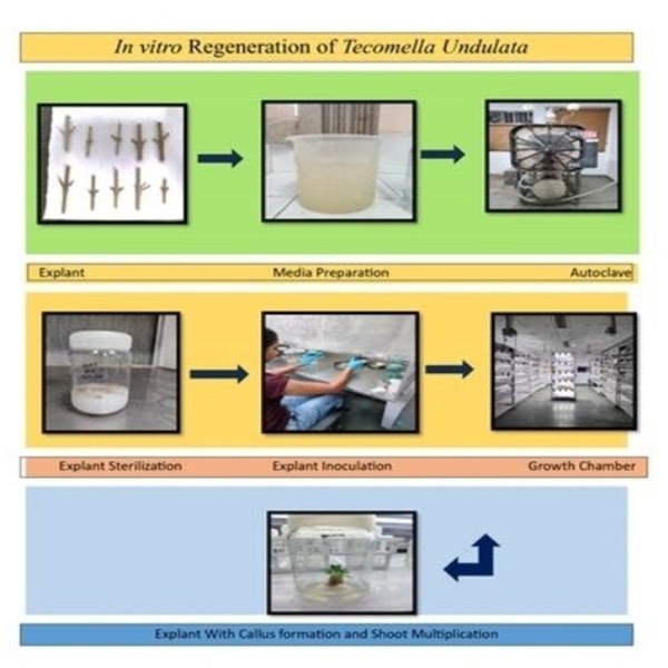 Tecomella undulata (Sm.) is an important tree species widely used in India. The present study developed an efficient in vitro mass propagation protocol for Rohida. The study evaluated sterilization agents, media and plant growth regulators for the clonal propagation of Rohida using nodal and shoot-tip explants. The most successful sterilization treatment involved HgCl2 (0.1 %) for 3 min, followed by Bavistin (0.2 %) and Streptomycin (0.2 %) for 15 min. This protocol achieved 100 % explant survival. Among different media compositions, nodal explants showed the highest callus formation (73.3 ± 12.48) in EM7 (MS + BAP 2.0 mg/L + NAA 0.01 mg/L), while the control showed no callus formation. For shoot-tip explants, EM7 also resulted in the highest callus formation (86.6 ± 8.18 %) and the control produced no callus. EM10 (MS + BAP 2.5 mg/L + NAA 0.1 mg/L) led to the highest shoot initiation (86.7 ± 13.34 %) in nodal explants, with an average of 19 days for shoot induction. Similarly, EM10 produced the highest shoot initiation (93.3 ± 6.68) in shoot tip explants, with an average induction time of 11 days. The highest rooting percentage (66.6 %) was observed in EM4 (Half MS+ IBA 2.5 mg/L) with average of 40 days required for root induction. The survival rate of plantlets transferred to soil + vermiculite (1:1) potting mix under greenhouse conditions was 48 %. These findings provide valuable insights into optimizing propagation techniques for Tecomella undulata. In the current study, shoot tip explants proved to be superior to nodal explants for regeneration.